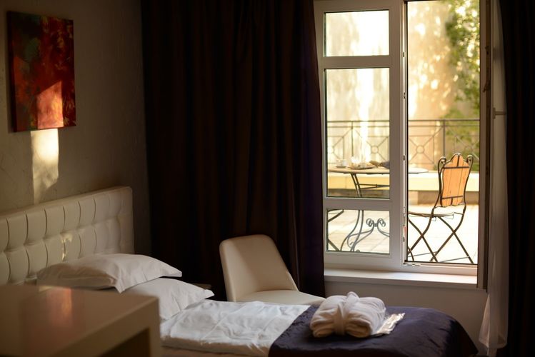 Одноместный номер площадь. 18,5 кв.м. Номер имеет оригинальный дизайн в стиле HiTech и барную зону. Собственная терраса площадью 20 кв.м с шезлонгами.